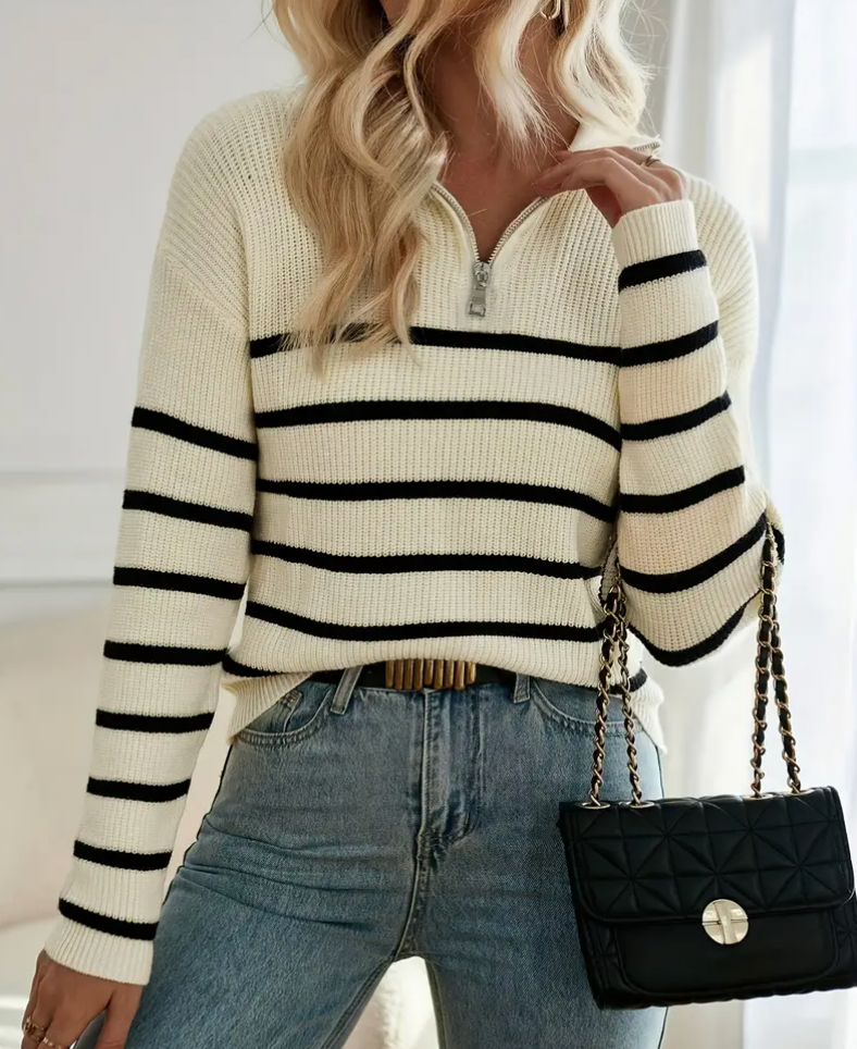 Victoria - Stribet Sweatshirt med Halv Lynlås