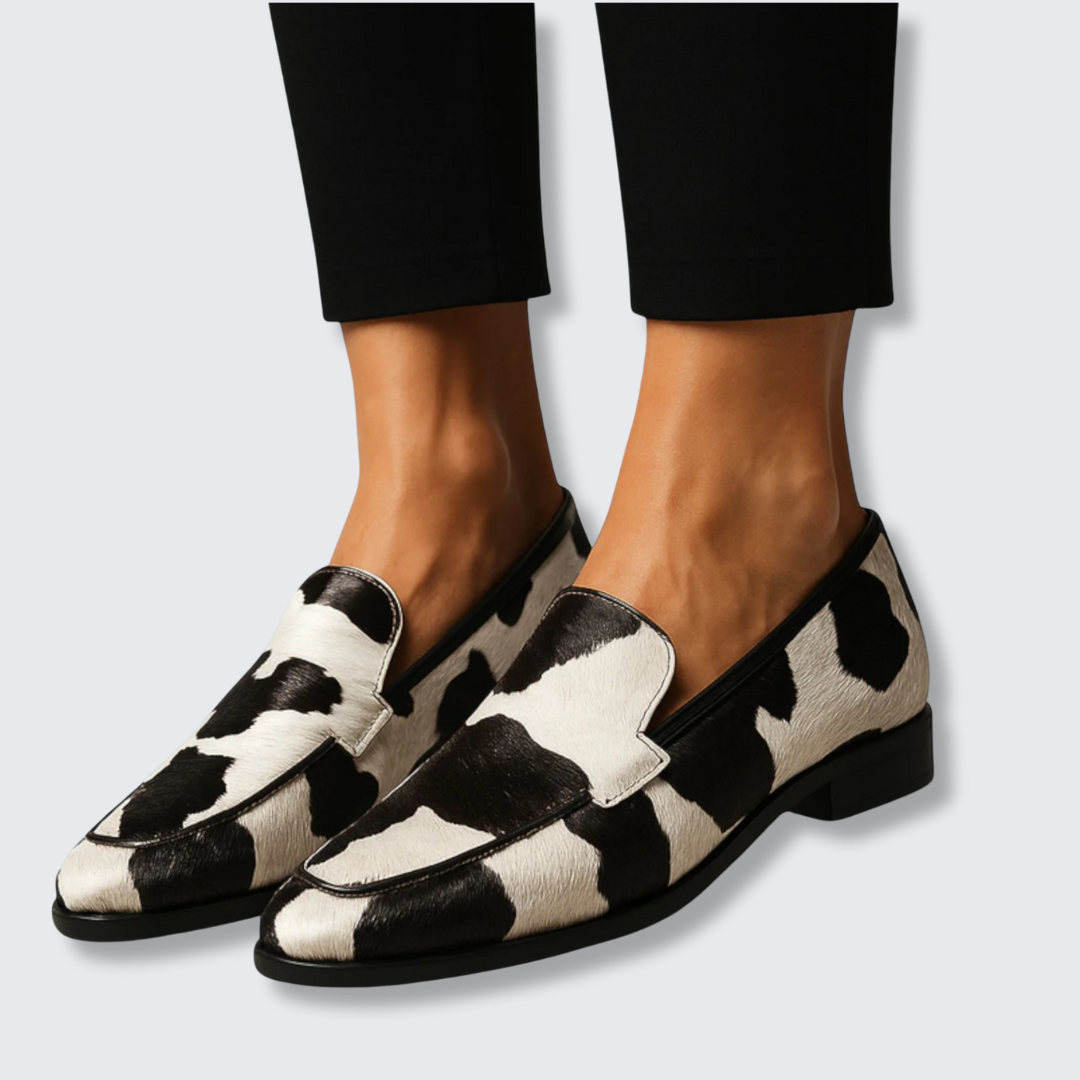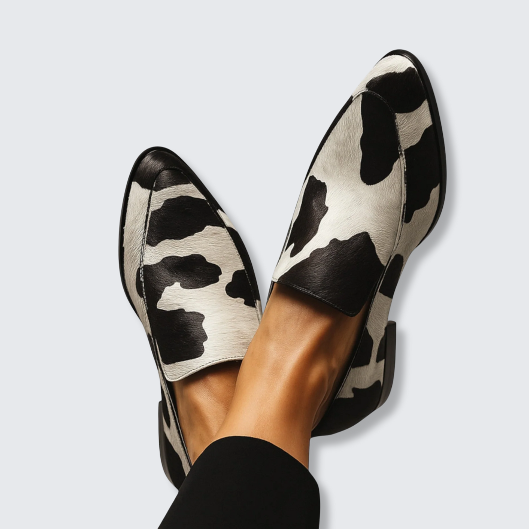 Disse unikke loafers kombinerer en slank silhuet med et dristigt ko-print. Det moderne design med spids snude giver et elegant udtryk, mens de markante sort-hvide mønstre tilfører ethvert outfit et legende og stilfuldt præg. Med en komfortabel pasform og praktisk slip-on design er de ideelle at bære hele dagen – fra casual chic til et modigt fashion look.